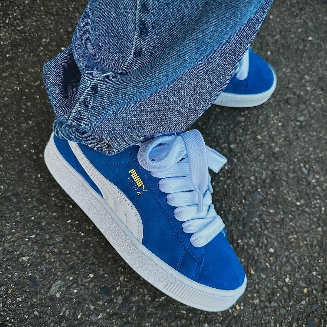 The Puma Suede XL "Blue" gives the iconic Suede silhouette a modern update with oversized proportions and bold styling. The upper features rich blue suede, contrasted by a white leather Puma Formstrip along the side panel. A padded collar and tongue enhance comfort, while gold Puma branding on the tongue and heel adds a touch of vintage flair. The thick rubber outsole provides improved grip and a chunky, retro-inspired look. Staying true to its skate and streetwear roots, the Suede XL "Blue" delivers timeless style with a contemporary edge.